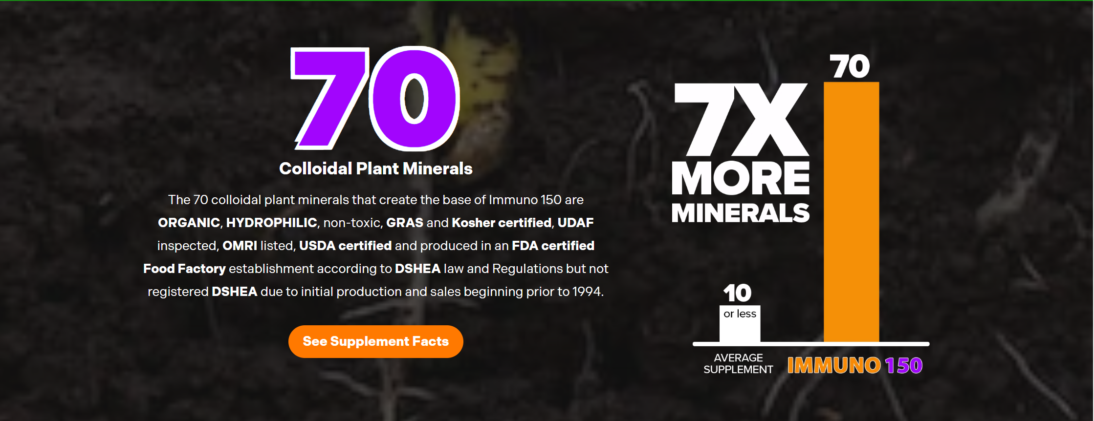 IMMUNO 150 was formulated to strengthen immune systems and correct many abnormalities.Its 70 plant-derived colloidal minerals are the key to its success.Blended with 80 carefully selected, premium nutrients, it’s one of the finest supplements available.